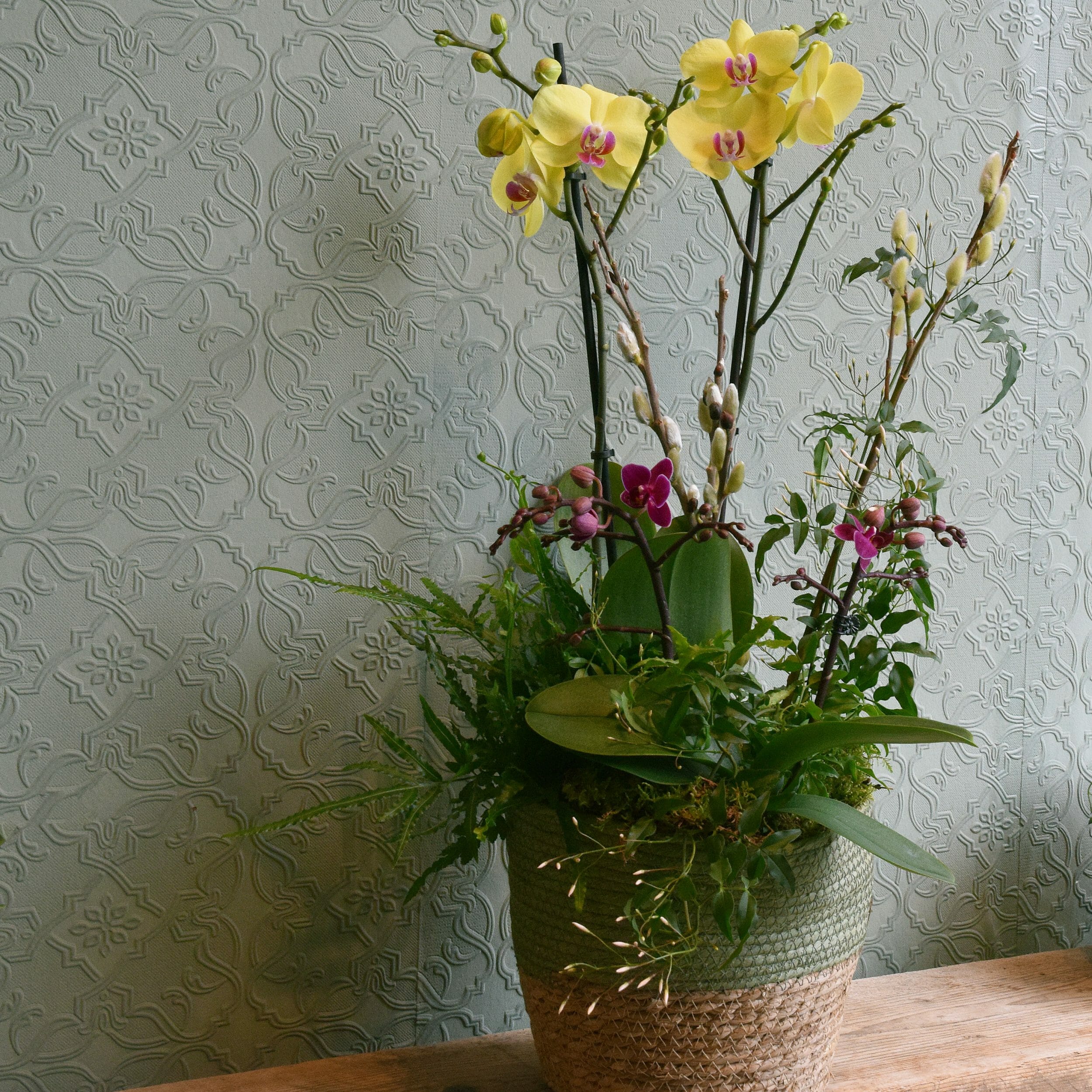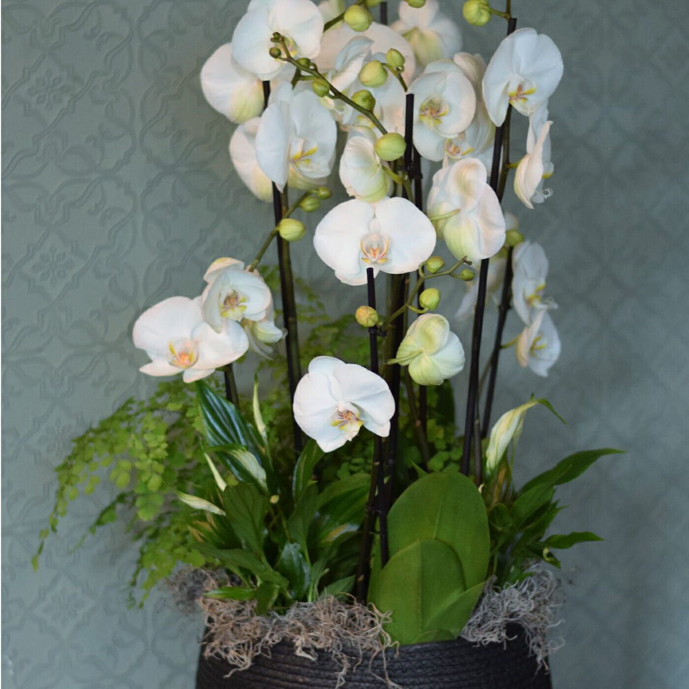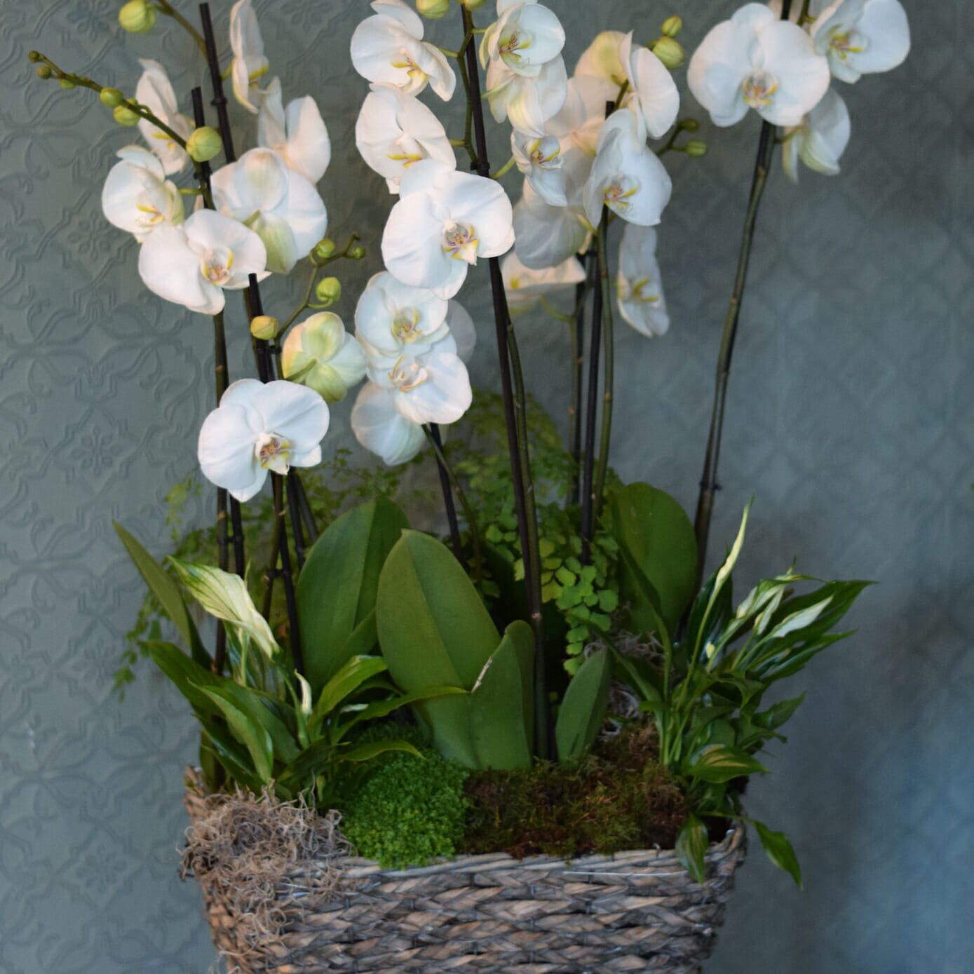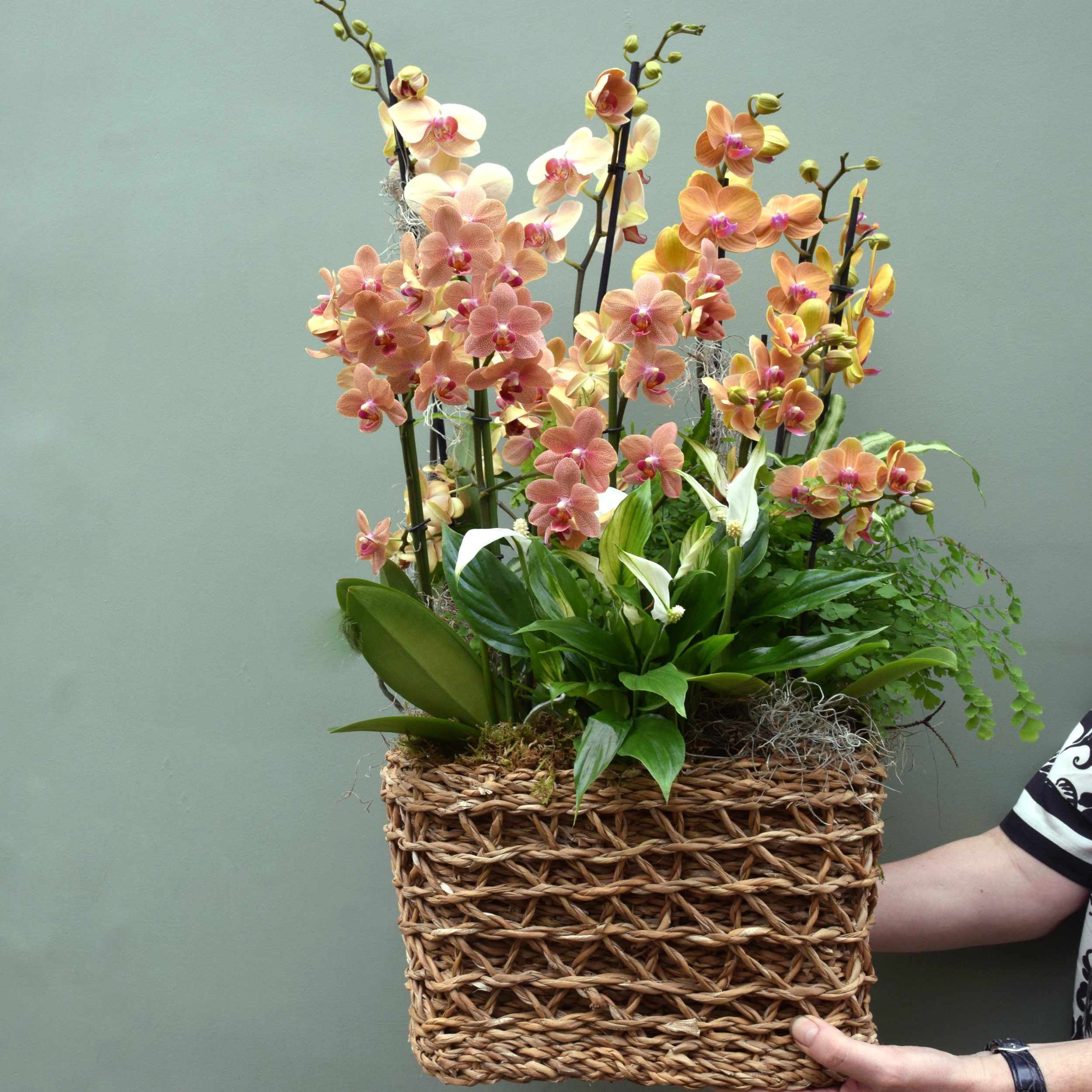 Orchid basket – basket filled with stunning double stem&/or triple  orchid plants with ferns and complimentary plants