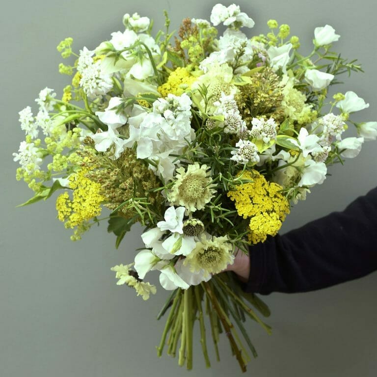 We tie our bouquets with natural seagrass twine or a hessian sash knot, dressed simply in all-white tissue and paper wrapping, which is recyclable and biodegradable.