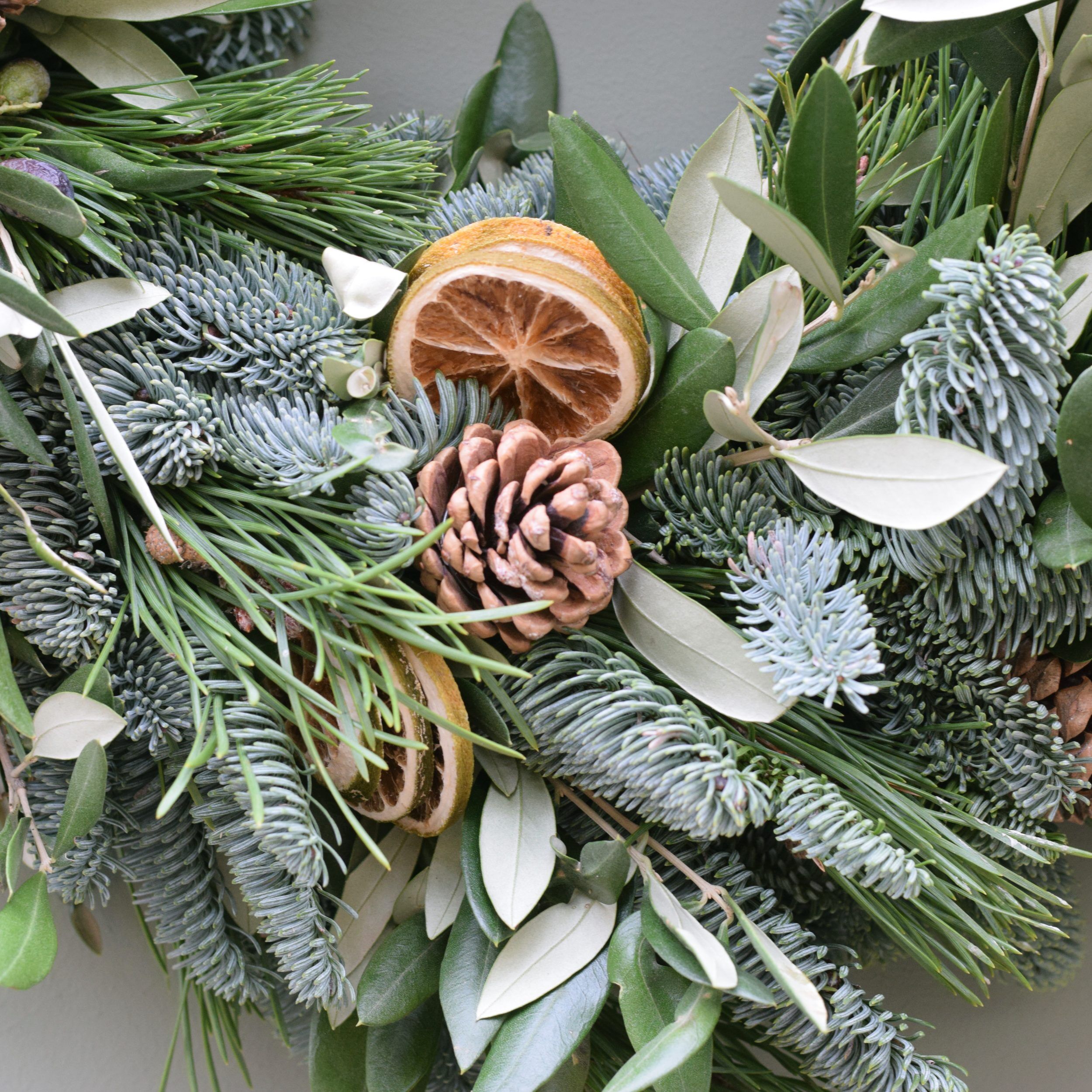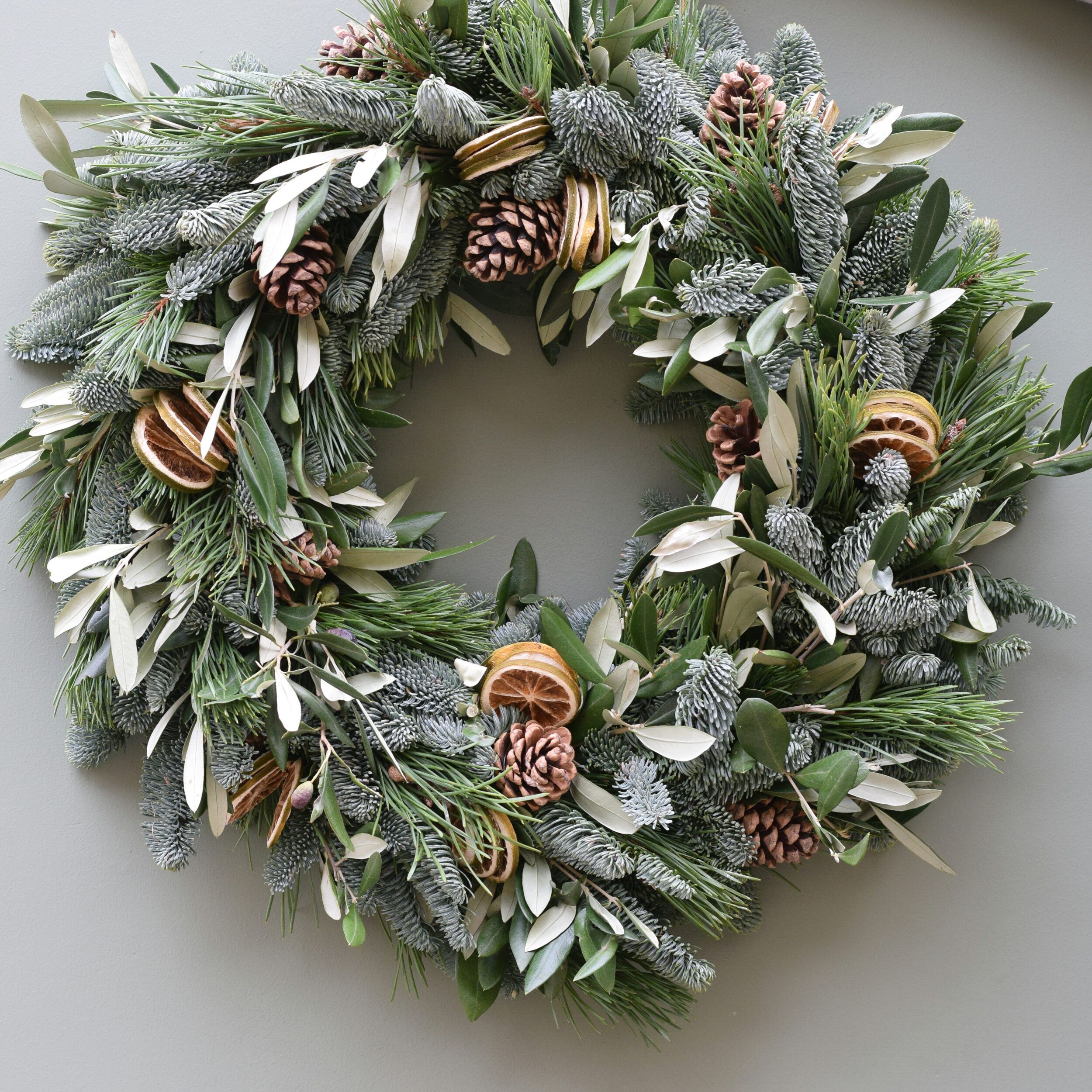 The Charlotte Christmas wreath is our fresh mixed pine & olive foliage wreath, dressed with dried green fruits & pine cones